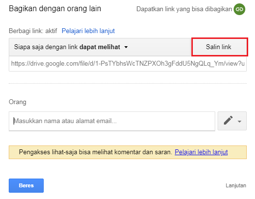 Selain sabagai media penyimpanan, google drive juga dapat digunakan untuk berbagi file kepada orang lain. Baik hanya sekedar membaca secara online ataupun file untuk didownload.