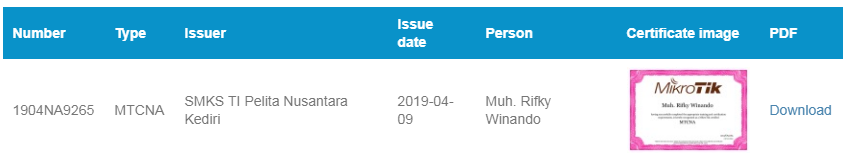 Seperti yang admin jelaskan diatas, jika score(nilai) 60% keatas dinyatakan lulus tes. Disini admin hanya mendapatkan nilai 63% saja karena waktu training tidak bisa hadir secara keseluruhan. Namun, dinyatakan lulus pun sudah suatu kebanggaan bagi admin sendiri. Jika sudah lulus sertifikasi MikroTik, kita akan mendapatkan sertifikat MikroTik secara langsung. Namun sertifikat ini berbentuk SoftCopy, anda bisa download file sertifikatnya pada akun MikroTik anda pada halaman Training ➤ My Certificates.